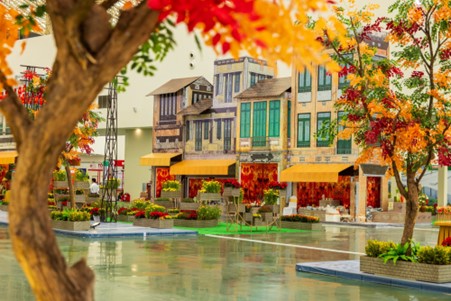 Với quy mô 17.000 m², “Tinh hoa Thu Hà Nội” được dàn dựng như một hành trình đi ngược thời gian. Lối vào là cổng chào vàng rực hoa cúc, con đường lát đá dẫn người xem qua những mái ngói cổ, những khung cửa gỗ, và tiếng đàn bầu ngân nga.